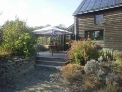 Une terrasse en bois douglas de 50 m² est située au Sud, sur un jardin d'ornement desservant le salon, la salle principale et l'arrière-cuisine qui permet d’accéder au jardin potager.