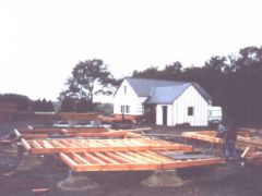 Le seul bois utilisé pour la construction de cette maison est le pin douglas. L'ossature a été réalisée par un charpentier professionnel. Jacky a participé au montage des panneaux réalisé en atelier. Le charpentier n'a pas pu délivrer de garantie décennale car le DWD utilisé en contreventement n'avait pas d'agrément en France à ce moment là (il était agréé en Allemagne et l'est devenu en France l'année qui a suivi la construction).