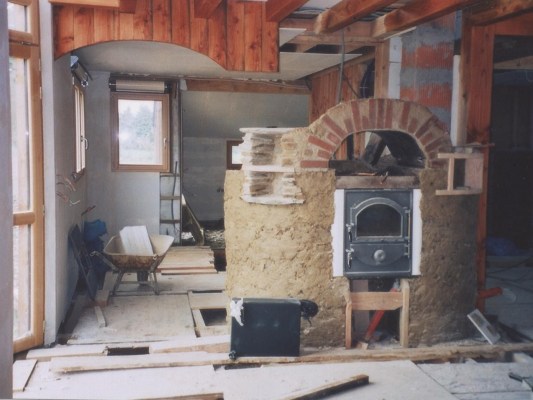 Le chauffage repose uniquement sur un poêle de masse réalisé avec un poêle alsacien (Oliger) autour duquel Jacky a maçonné 15 tonnes de terre, apportant ainsi de l'inertie, point faible des maisons bois.