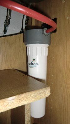 Deux cuves en béton de 10 m3 chacune sont enterrées dans le jardin, une petite cave a été construite à côté. L'eau des gouttières de la maison arrivent dans ces cuves en étant filtrées à l'entrée, elle est pompée puis mise en pression dans la maison en étant filtrée 2 fois à 5 microns ; avant de la consommer, elle est encore filtrée par un filtre Doulton. Après analyse, elle s'est avérée tout à fait que potable.