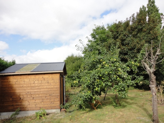 Un bel abri de jardin de 12 m² a été installé, il est en ossature pin du nord avec un habillage extérieur en épicéa.