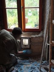 Les fenêtres (Pro-fermeture, deux voisins du village) sont à double vitrage. Celles des murs sont en pin des Landes brut, la propriétaire les a recouvertes de peinture Kreidezeit et de lasures maison.